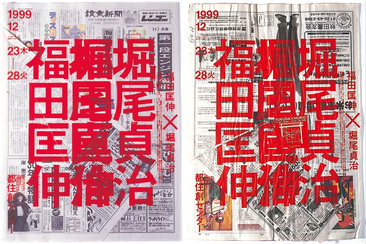 1999年に旧都住創センターで行われたコラボレーション展の作品群が、2025年に再び注目されて紹介されました。杉崎真之助が制作したポスターをベースに、作家・堀尾貞治氏がアートとして展開したものです。写真家・福田匡伸氏は型押しで参加。ポスターのオリジナル作品は新聞紙にシルクスクリーン印刷。