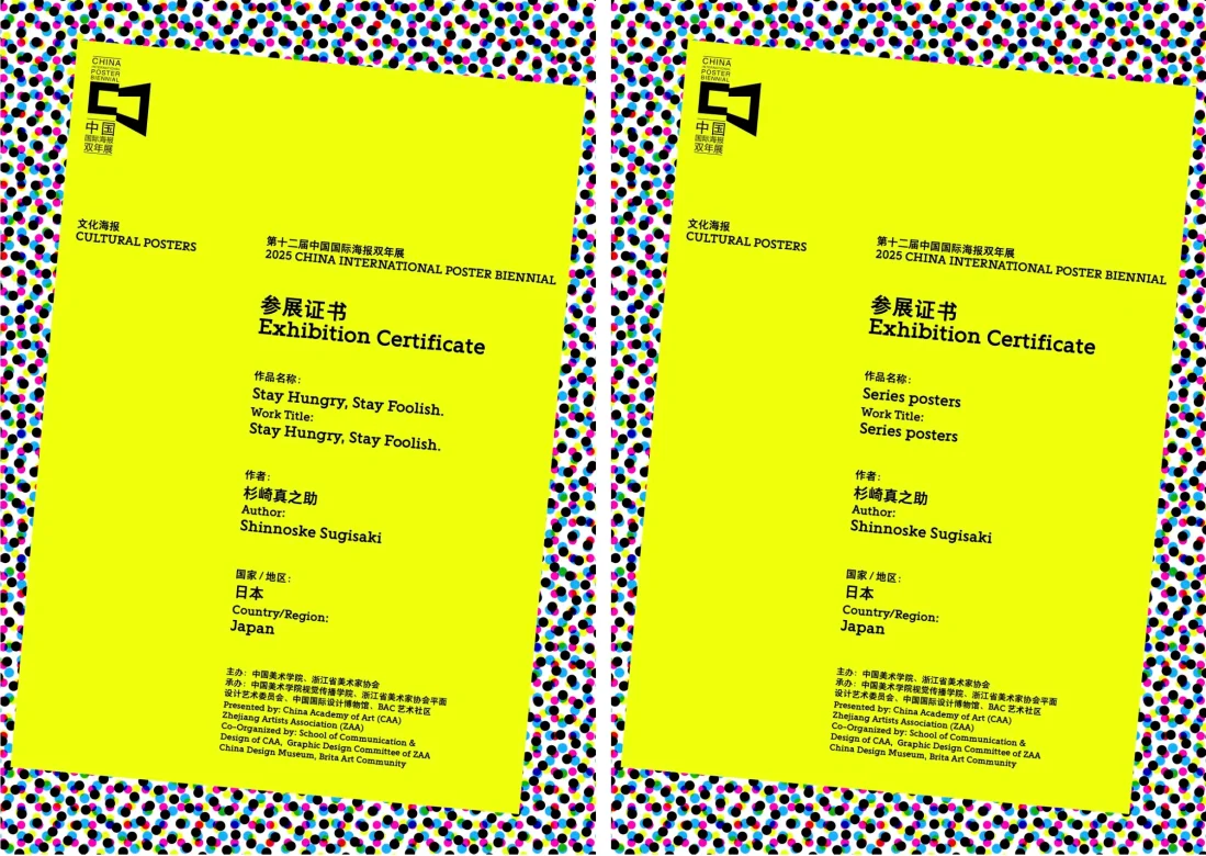 中国・杭州の中国美術学院が主催する「12回中国国際ポスタービエンナーレ(CIPB2025)」に杉崎真之助のポスター2点が入賞。デザイン団体のためのタイポグラフィ作品。