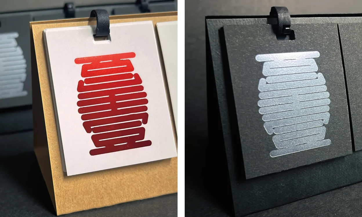 今回はサステナブルをテーマに2026年日めくりカレンダーの「玉」(数字)をデザインして箔で表現。杉崎真之助は2、王怡琴は1を担当しました。